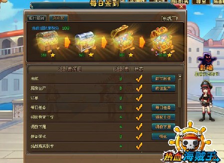 玩家们可以通过活跃度系统界面直接开启活跃度任务,更加方便快捷。活跃度系统在每日签到中可以看到,界面中所列出的所有项目,都是海贼们日常必做的。通过这个界面,可以直接进行任务,并且可以随时查看当天的进度。每完成一个活跃度任务,就能积累到相应的活跃度积分。变态网页传奇私服玩家交流群:132256214